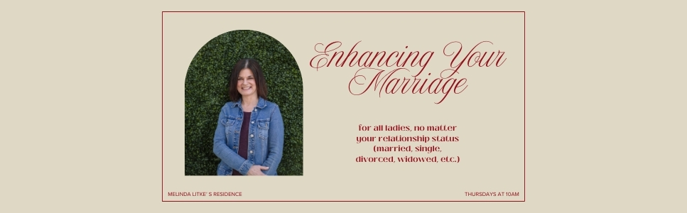 We will meet weekly at Melinda's home starting February 12th and go through April 30th. You will need to purchase the book “Enhancing Your Marriage” by Judy Rossi before the 2nd meeting. This bible study is not limited to just married ladies. The book we will be studying is good for anyone who is married or is single, divorced, or widowed and looking to be married someday. “ Enhancing your relationship with your husband begins by enhancing your relationship with the author of marriage - Jesus Christ.”